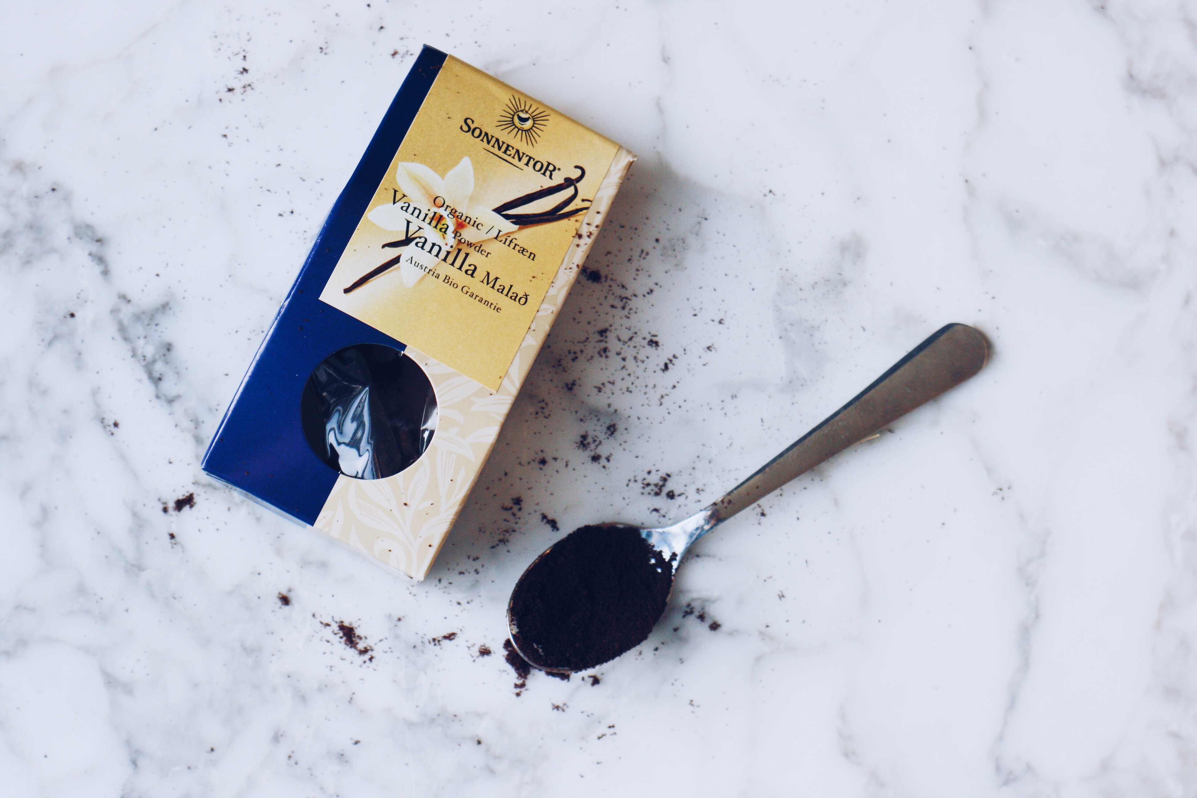 Margir spyrja mig að því hvað vanilluduft sé og hvar það er að finna. Ég nota þetta hér frá Sonnentor og fæst það m.a. í Heilsuhúsinu. Svona askja dugar heillengi því að maður þarf svo örlítið af þessu til að gefa góðan vanillukeim.